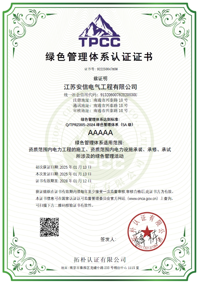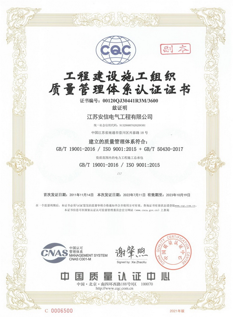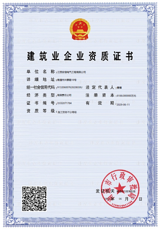 在創(chuàng)業之初,公司就堅持高起點的戰(zhàn)略思路,廣納賢才,集聚行業精英,創(chuàng)新發(fā)展,做優(yōu)企業品牌。現已取得:承裝二級、承修二級、承試二級,電力工程施工總承包二級,輸變電工程專業承包二級,建筑工程施工總承包二級,建筑機電安裝專業承包二級,地基基礎專業承包二級資質證書,并通過了質量、環(huán)境、職業健康和安全管理體系認證,確保各項工作有序管控。